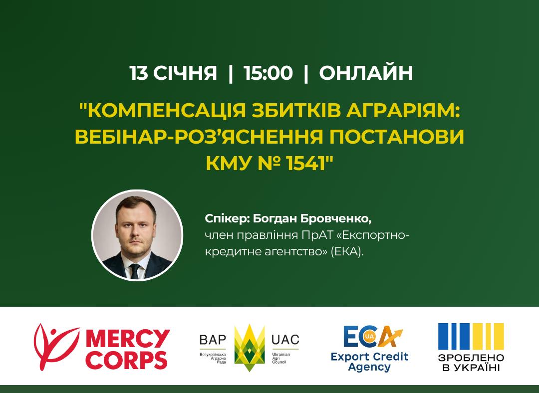 The Ukrainian Agri Council (UAC) invites agricultural producers to an explanatory webinar on Cabinet of Ministers Resolution No. 1541 dated November 28, 2025, by which the Cabinet of Ministers of Ukraine approved the Procedure for granting partial compensation for the value of property of business entities destroyed or damaged as a result of the armed aggression of the Russian Federation, as well as partial compensation of insurance premiums under war risk insurance contracts.