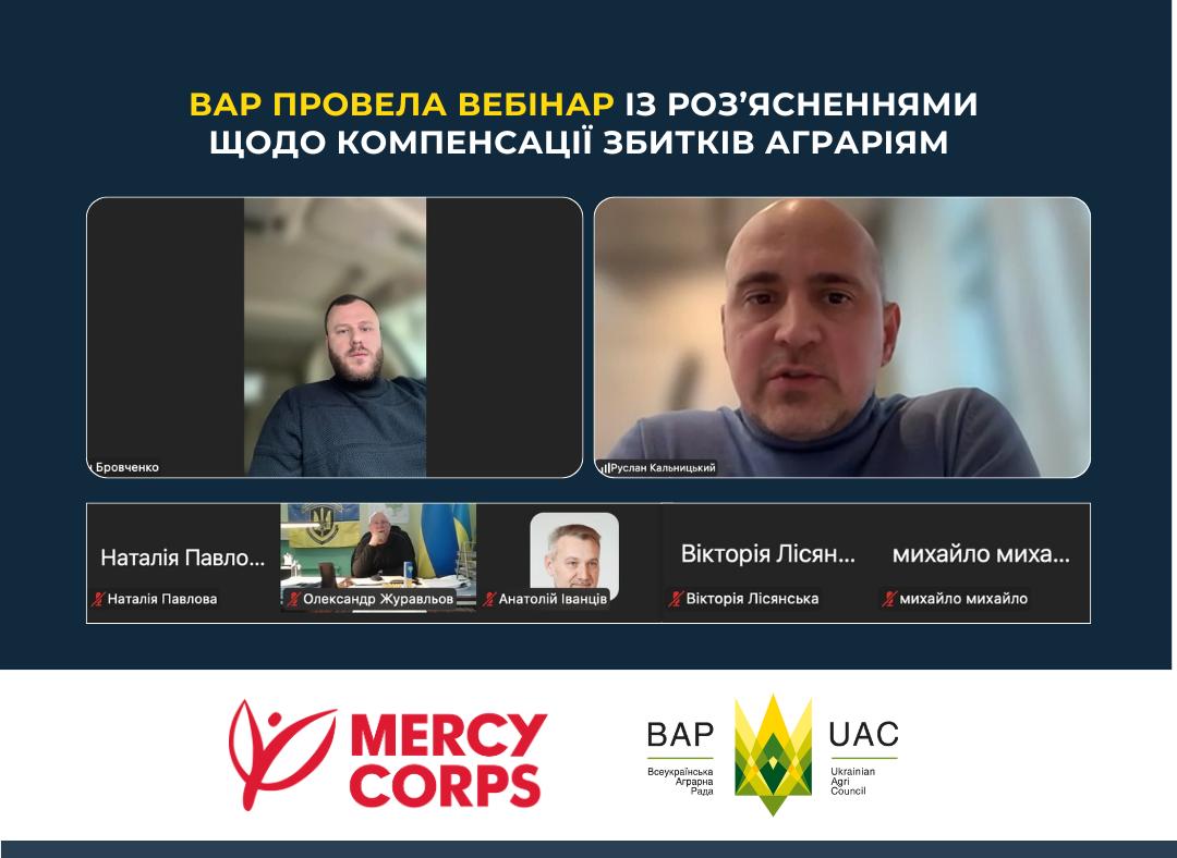 The webinar was held in cooperation with PJSC “Export Credit Agency” within the framework of a Ukrainian Agri Council project to support Ukrainian agricultural producers from affected regions, implemented in partnership with the international humanitarian organization MERCY CORPS, and is the first in a series of webinars aimed at informing farmers and improving the operational efficiency of agricultural enterprises.