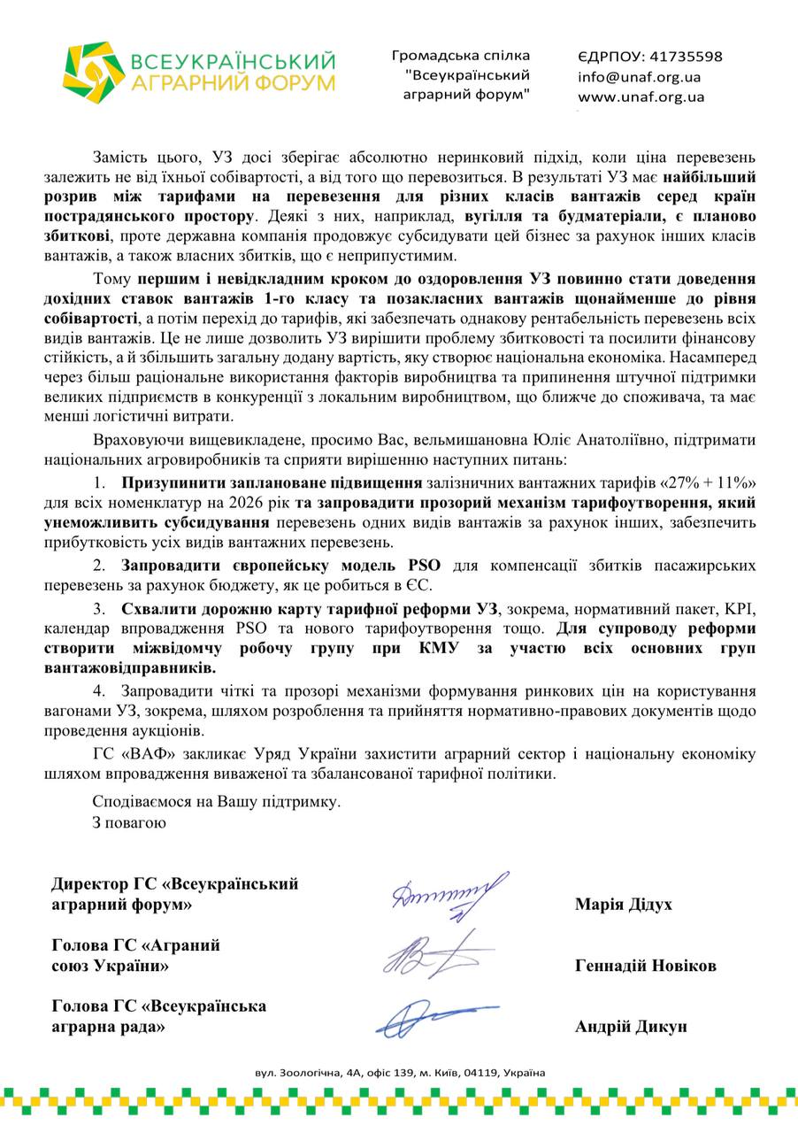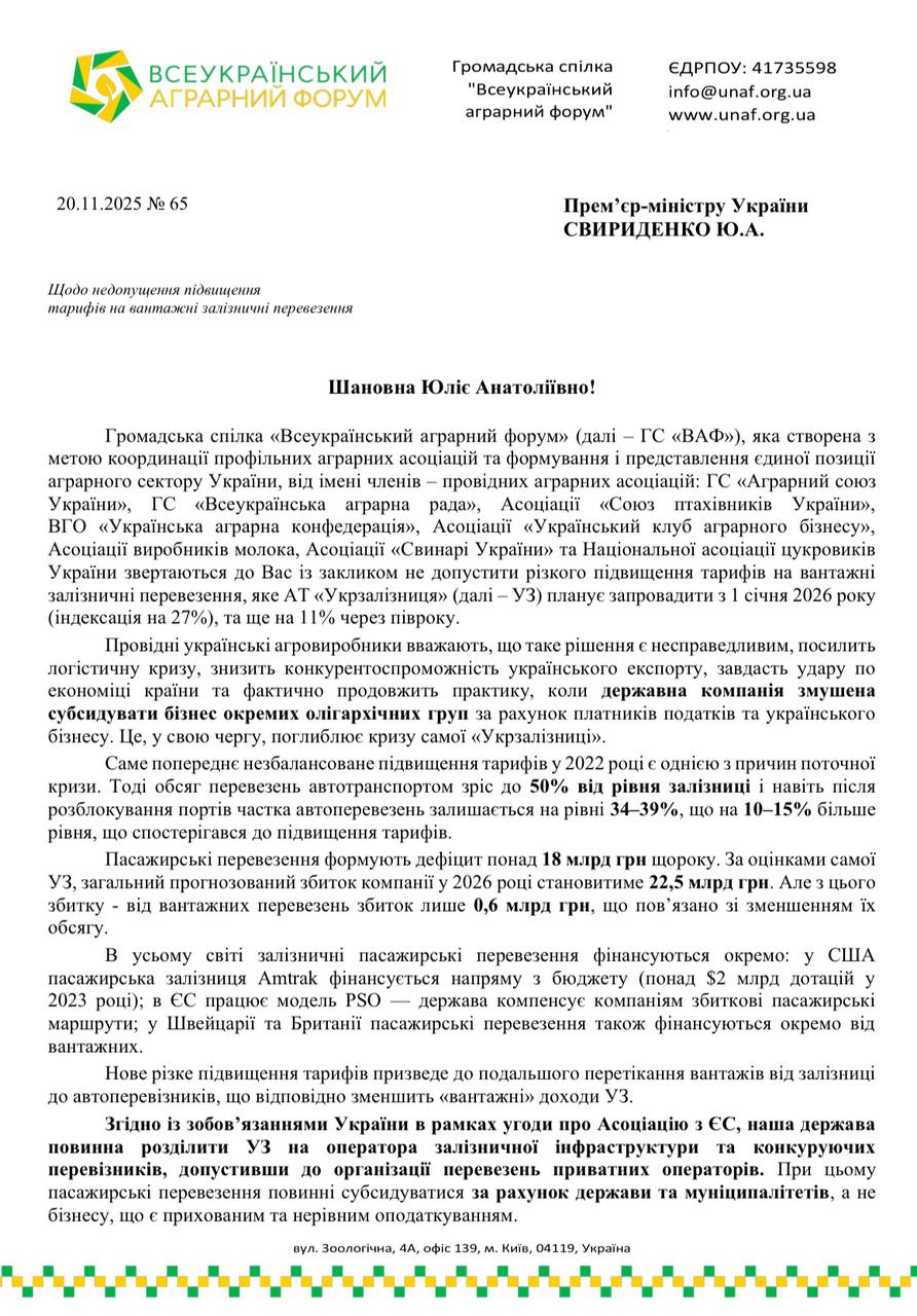 Всеукраїнська Аграрна Рада разом з профільними асоціаціями, які входять до Всеукраїнського аграрного форуму (ВАФ), звернулися до Прем’єр-міністра Юлії Свириденко з вимогою невідкладно зупинити заплановане підвищення тарифів на вантажні залізничні перевезення, яке «Укрзалізниця» планує запровадити з 1 січня 2026 року — індексацію на 27%, а через півроку — ще на 11%.