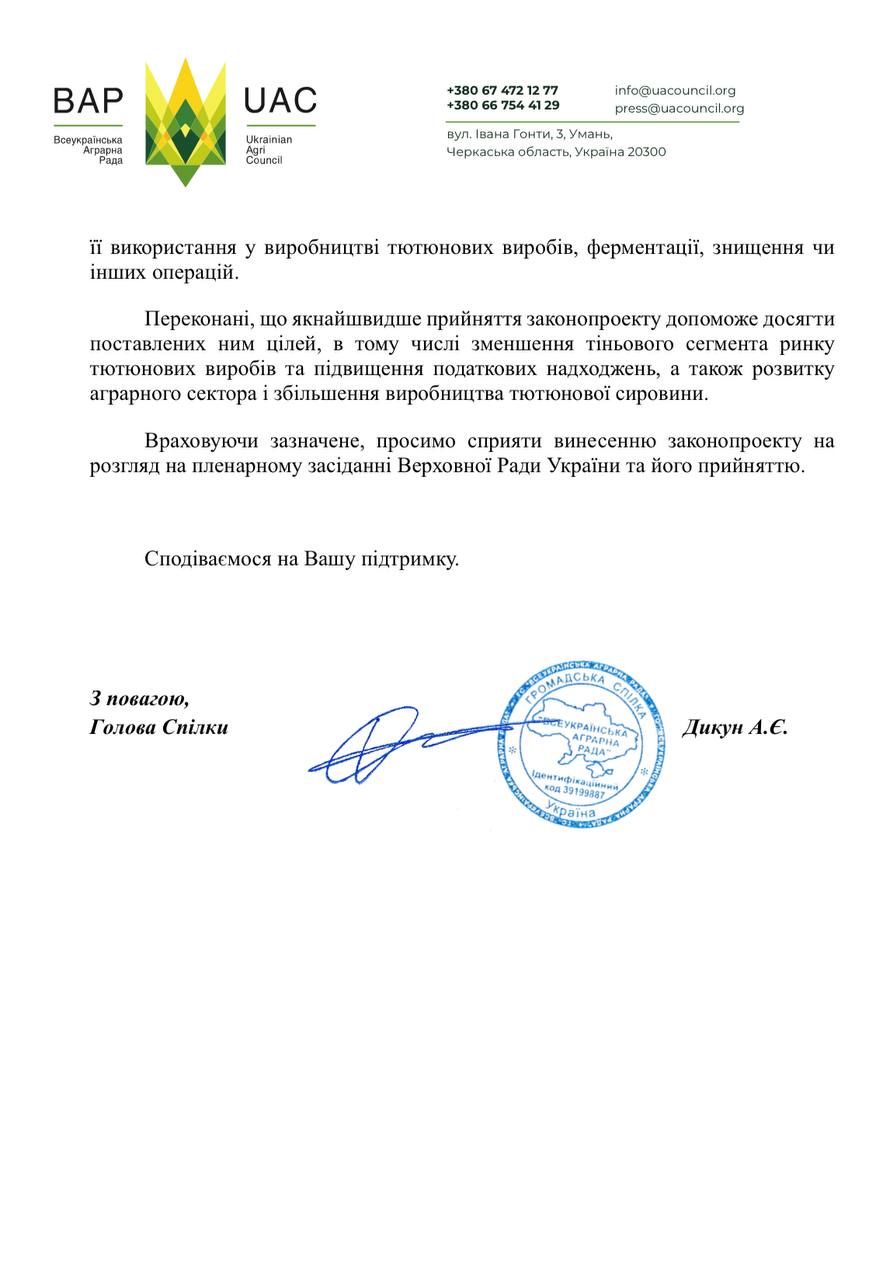 «Переконані, що якнайшвидше прийняття законопроєкту допоможе досягти поставлених ним цілей, в тому числі зменшення тіньового сегмента ринку тютюнових виробів та підвищення податкових надходжень, а також розвитку аграрного сектора і збільшення виробництва тютюнової сировини», — наголошується у зверненні.