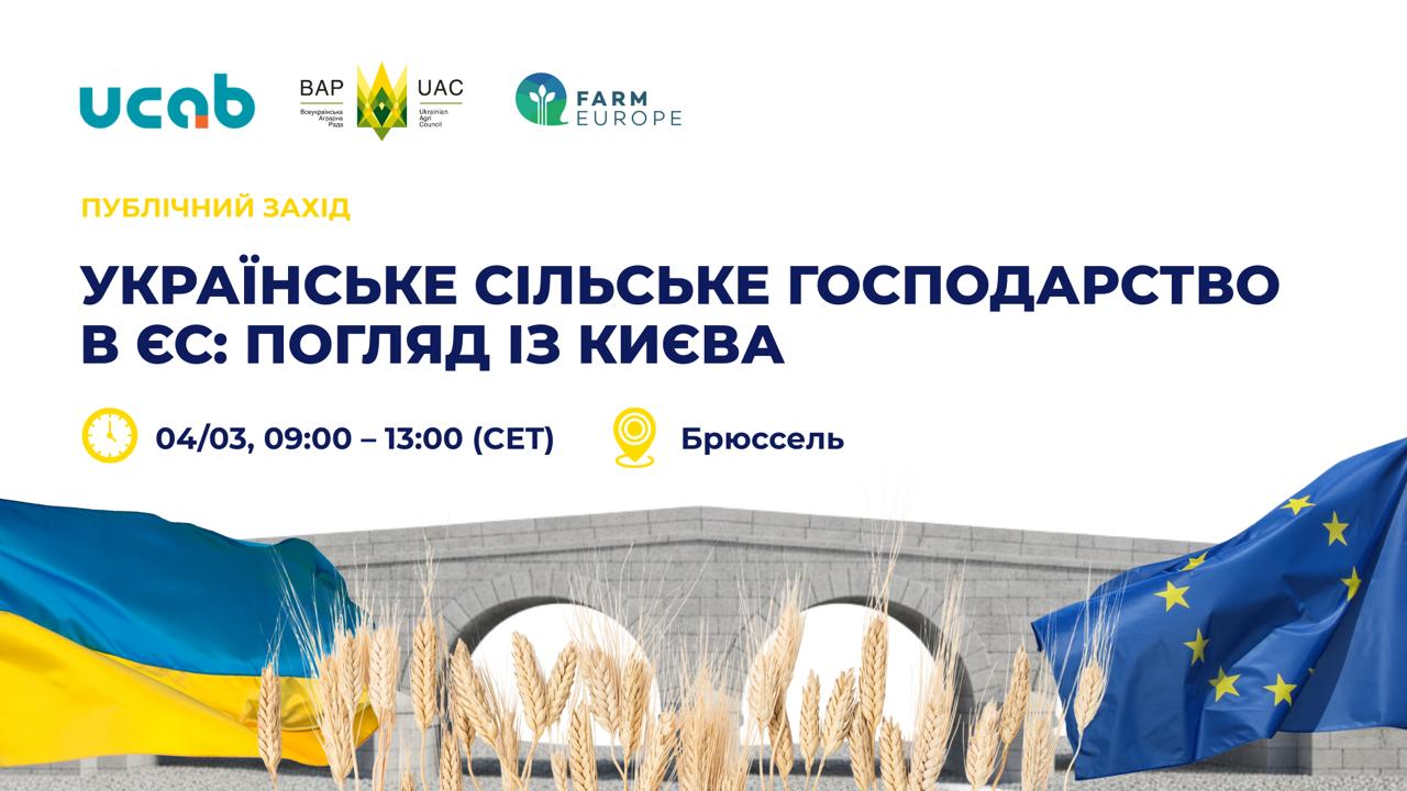 Асоціація «Український клуб аграрного бізнесу» (УКАБ) спільно з ГС «Всеукраїнська Аграрна Рада» (ВАР) запрошують вас на публічний захід «Українське сільське господарство в ЄС: погляд із Києва», присвячений європейській інтеграції українського аграрного сектору.